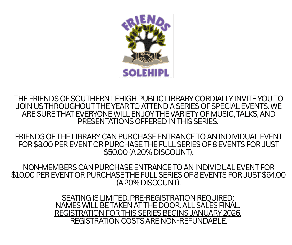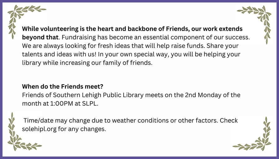 Have a question or need help finding something? The staff at Southern Lehigh Public Library is here to help. Reach out if you need assistance with your library account, locating materials, or learning more about upcoming programs.